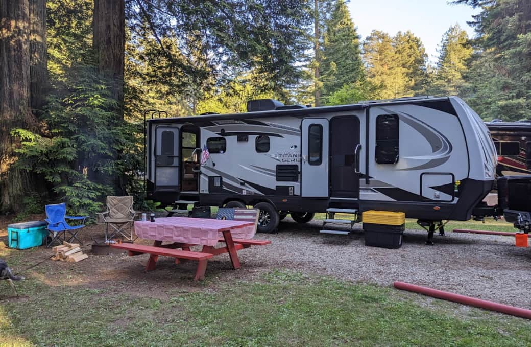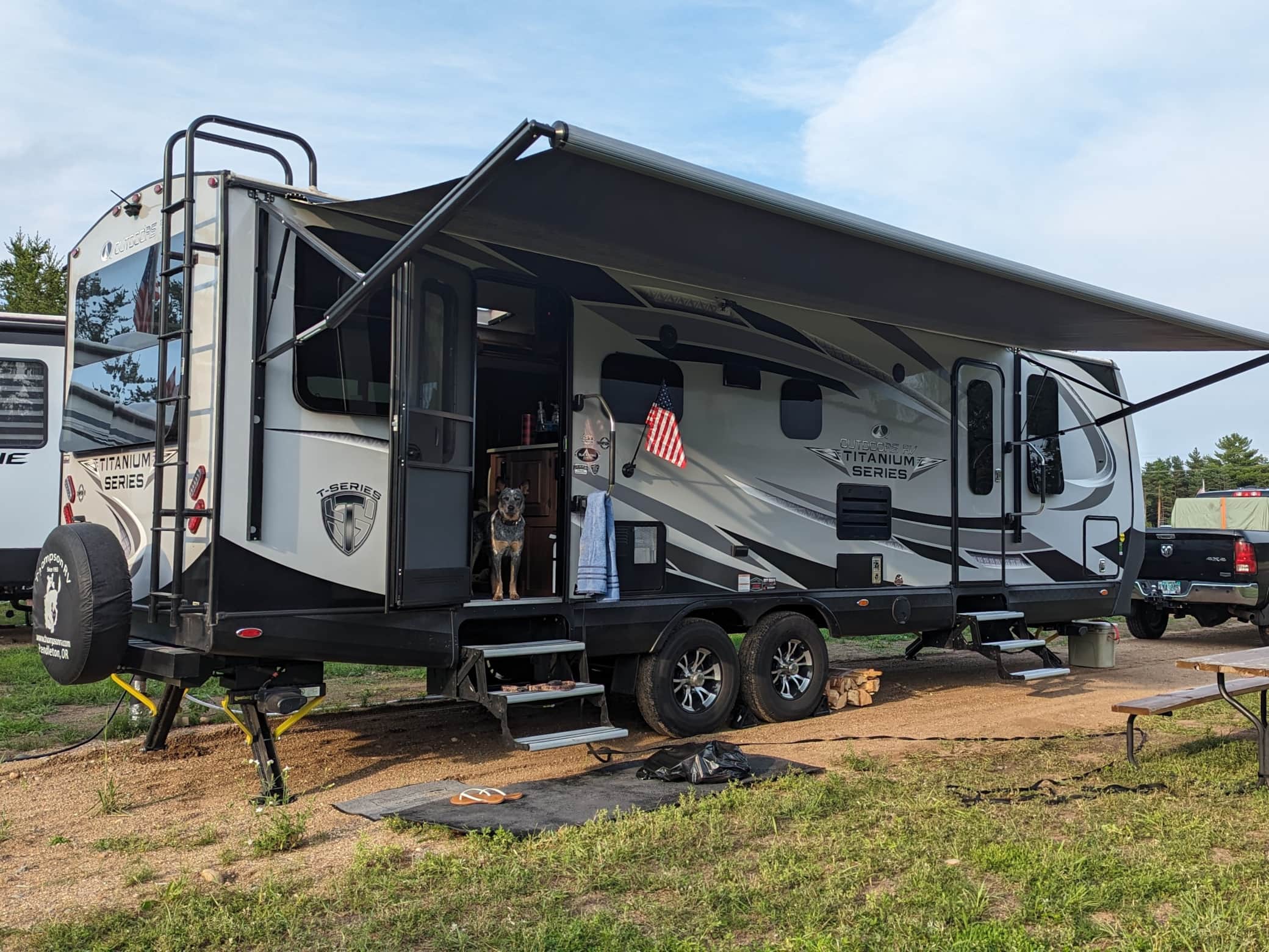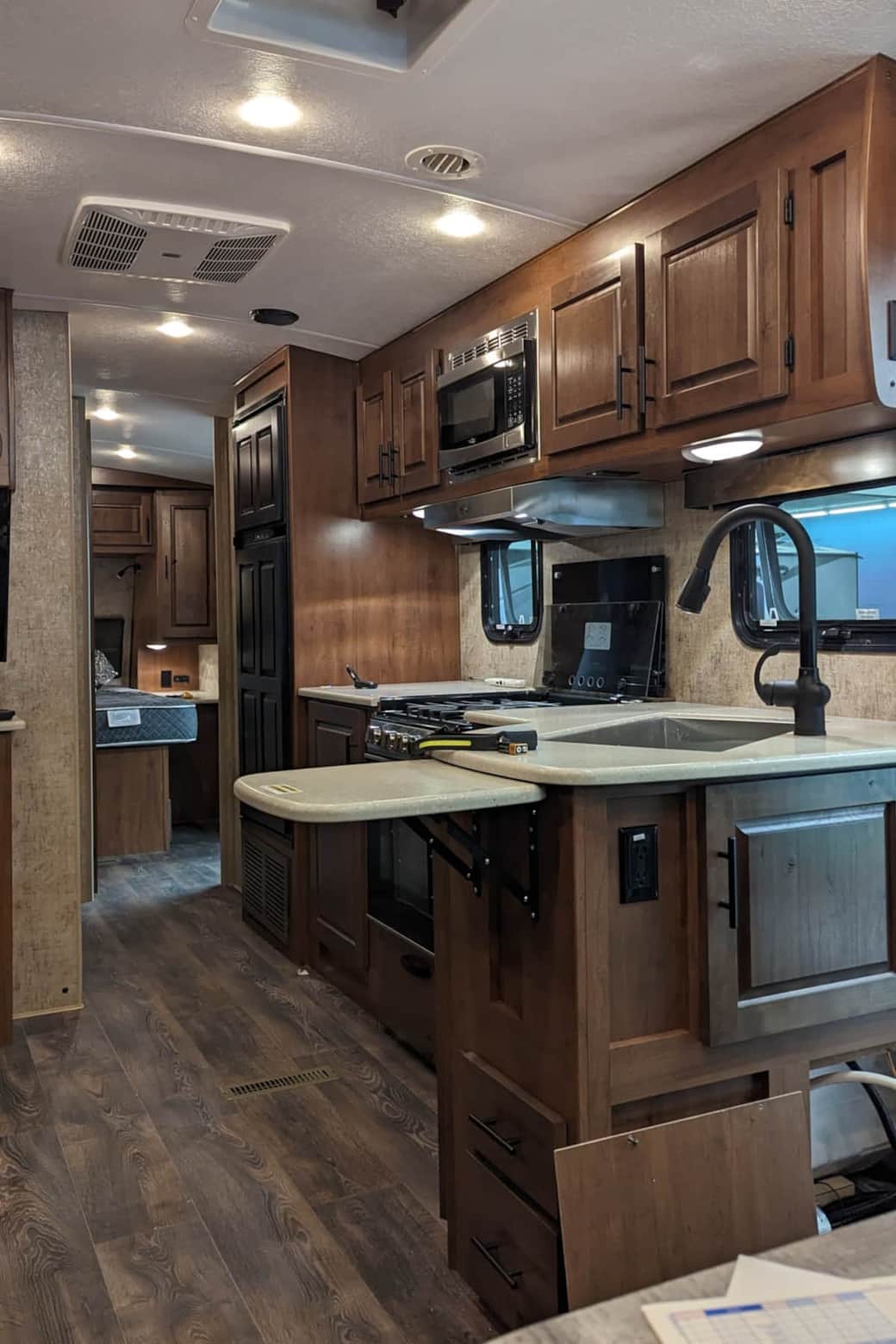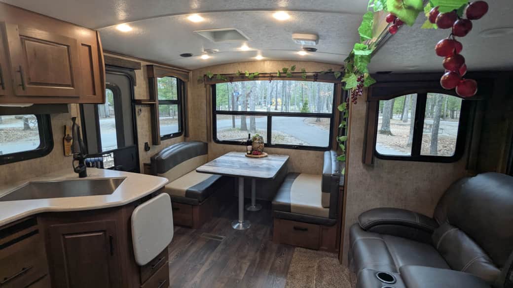 The Wine Den comes with a Queen-sized bed, a dining-to-bed conversion for the kids, and a small pillowtop for the dog. And because it's a Titanium series, Outdoors RV offers all the comforts of a home-away-from-home, with a large 10 gallon hot water tank, 80 gallon fresh water tank and 30 gallon separate gray/black tanks so you won't need to dump every day and a 30 lbs of propane. Tons of storage space inside with a pass-through storage outside for all your gear, as well as under the bed storage and a slide-out closet in the bedroom. The Wine Den uses 30 amp power to operate the centrally-located air conditioner and a forced-air fireplace for those colder nights cuddled up to a movie.